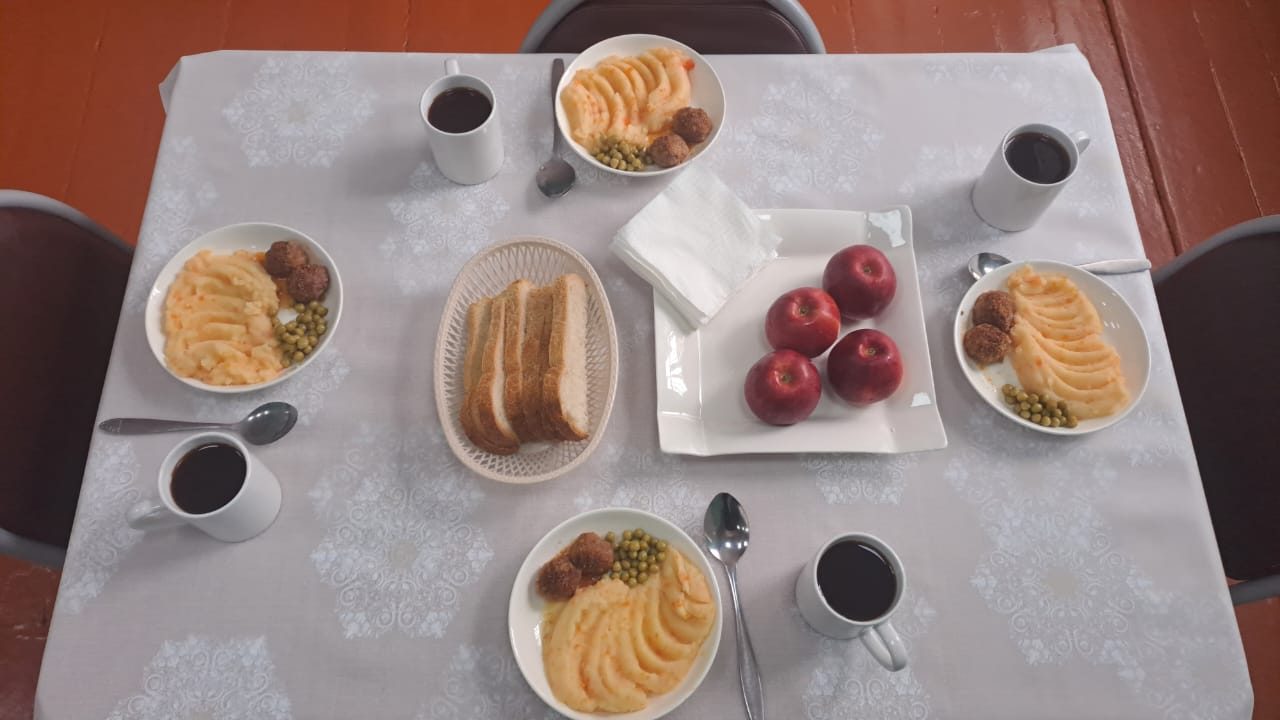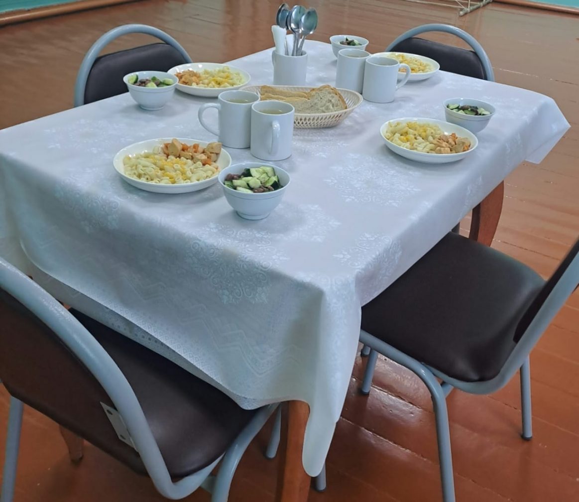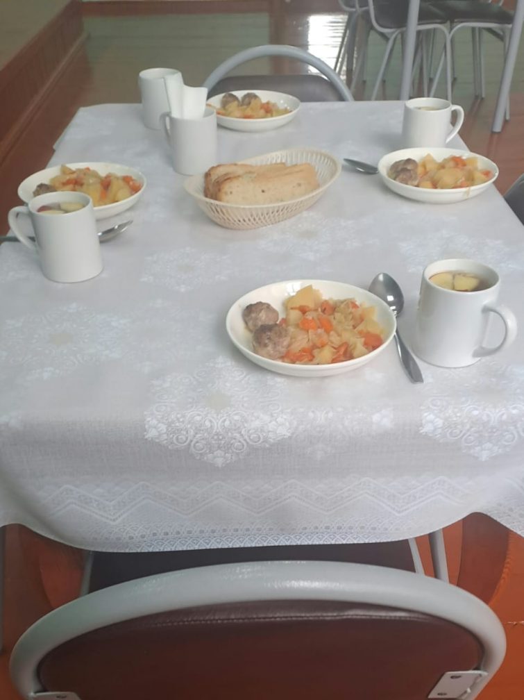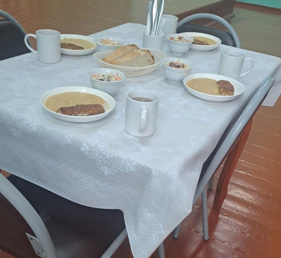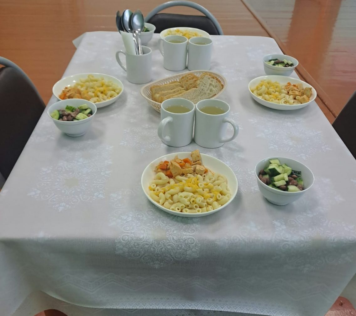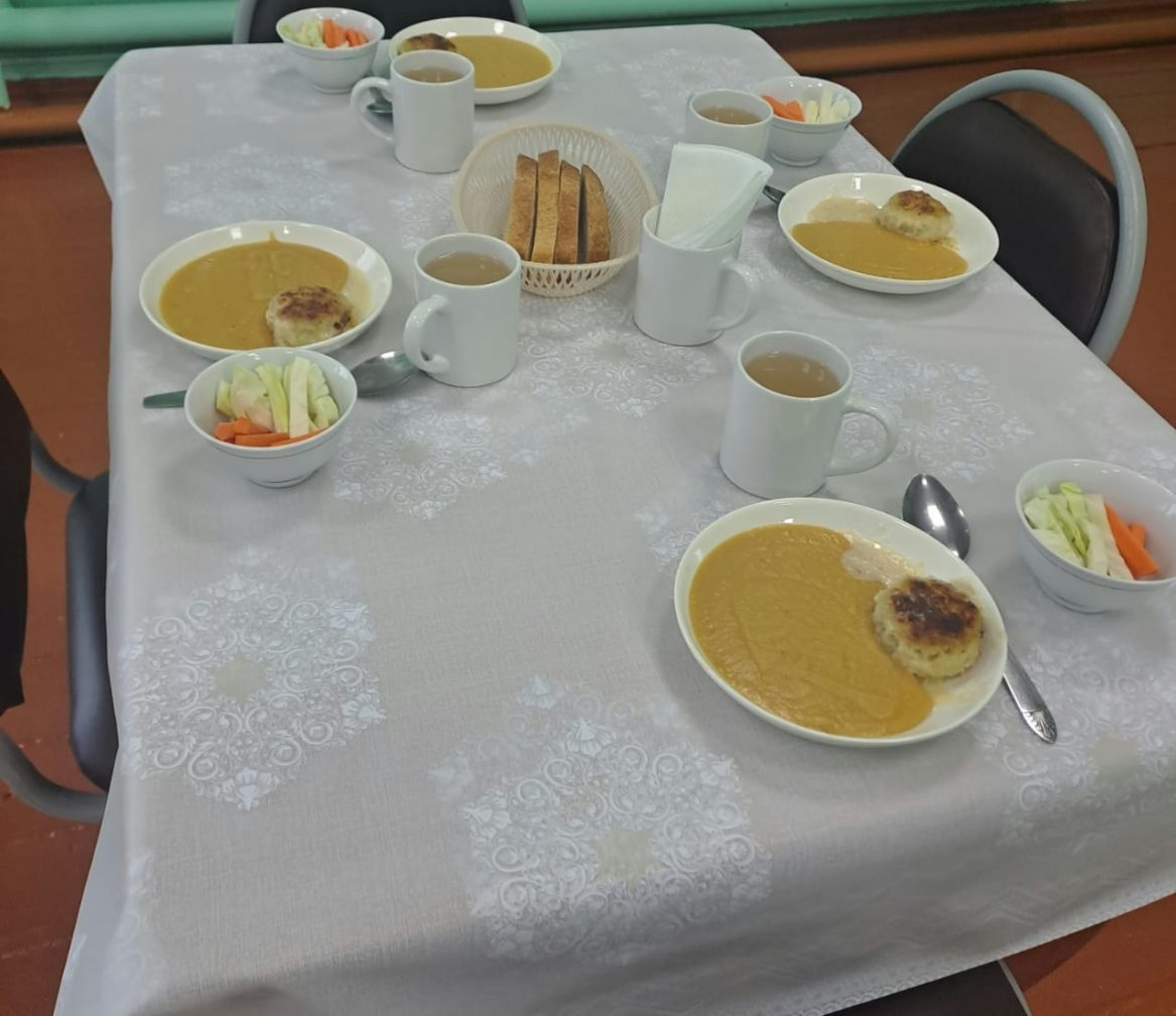 08.05.2025г. Меню: салат из белокочанной капусты и моркови, уха из горбуши, чай с лимоном и сахаром, хлеб, мёд.