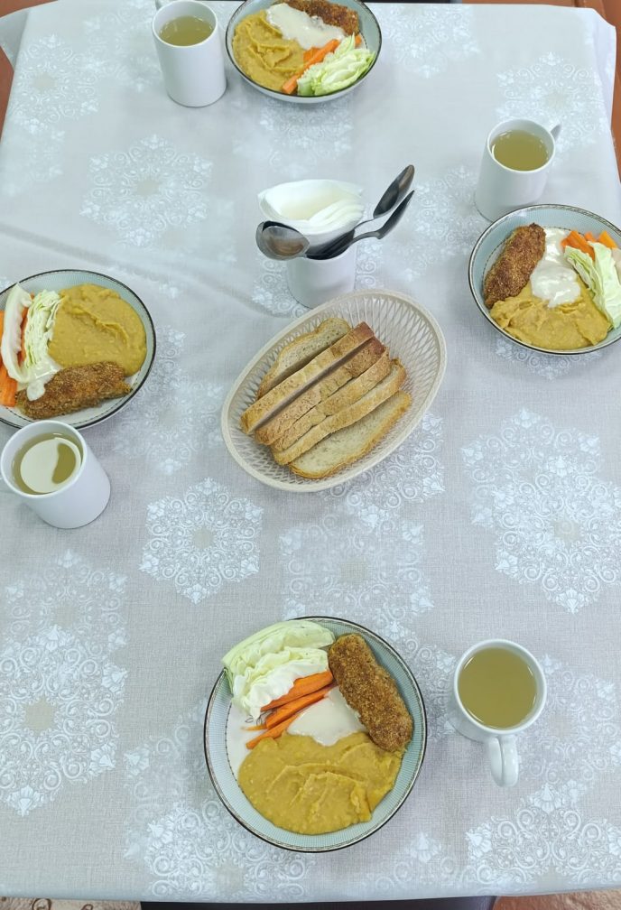 1.10.2025г. Меню: салат из белокочанной капусты с фасолью и морковью, куриные палочки запечённые, соус сметанный, пюре из гороха Буршак, напиток Денсаулык, хлеб.