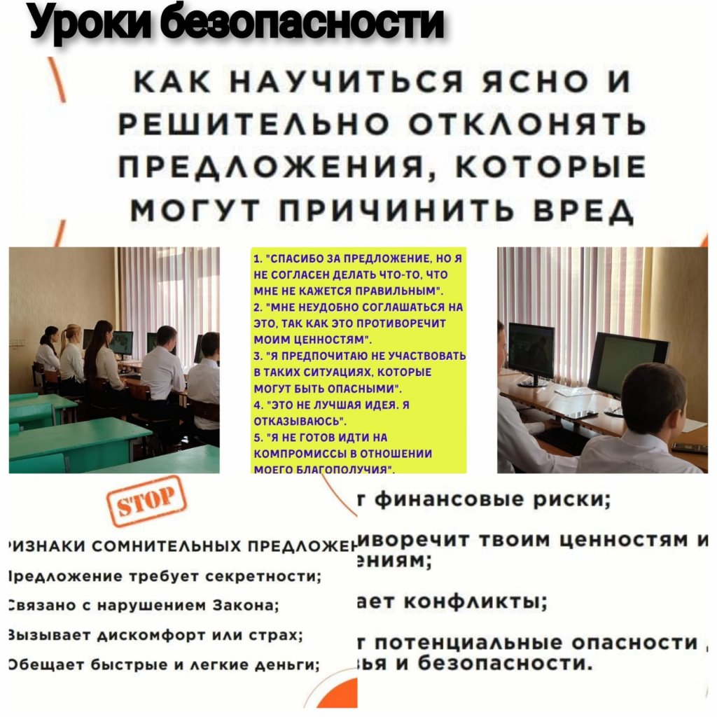 Сынып сағатында «Зиян келтіруі мүмкін ұсыныстарды анық және үзілді-кесілді қабылдамауды қалай үйренуге болады» қауіпсіздік сабағы өткізілді. Басқа адамдардың қысымына қарсы тұру және бас тартуды оңтайлы түрде білдіру қабілеті дамыды. Жағдаяттарды ойнау арқылы біз өз позициямызды қорғауда сенімді мінез-құлық дағдысын үйрендік.